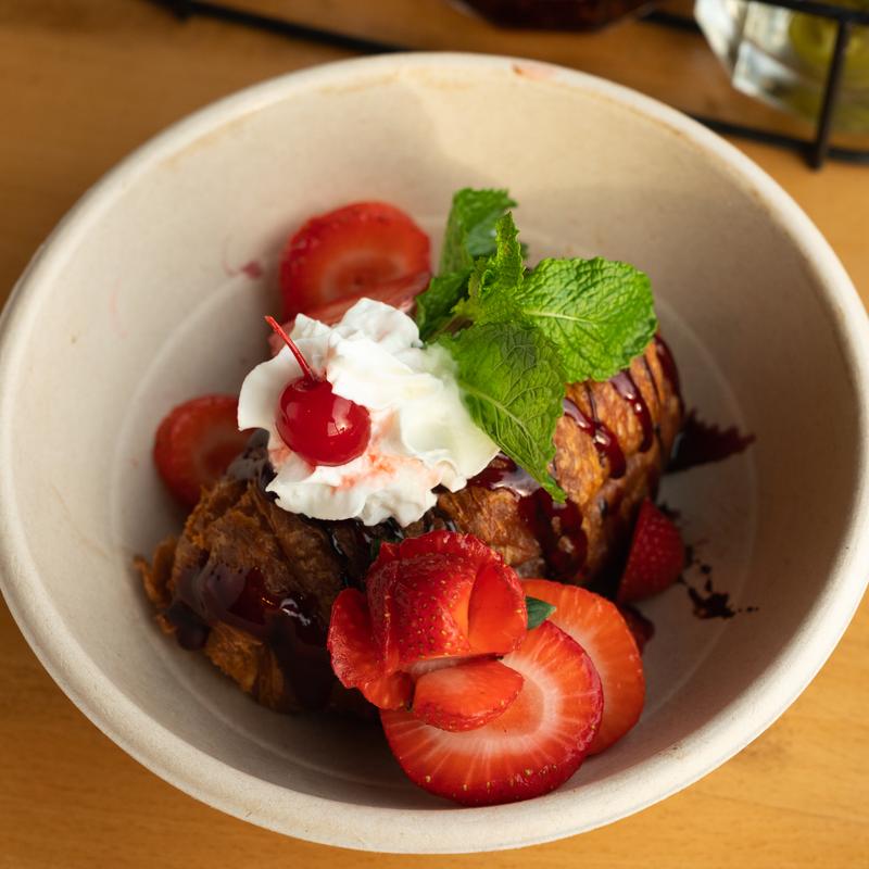 Vanilla ice cream wrapped in a crispy crust topped with chocolate & raspberry syrup