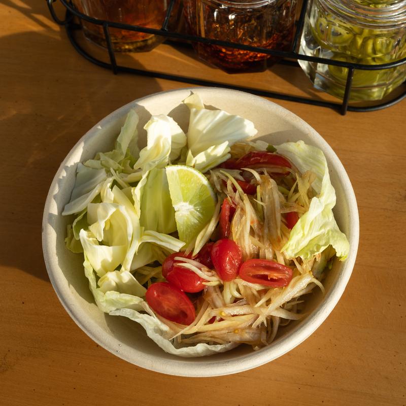 Papaya salad full of umami flavors with your choice of spice level - Mild, Medium, or Hot