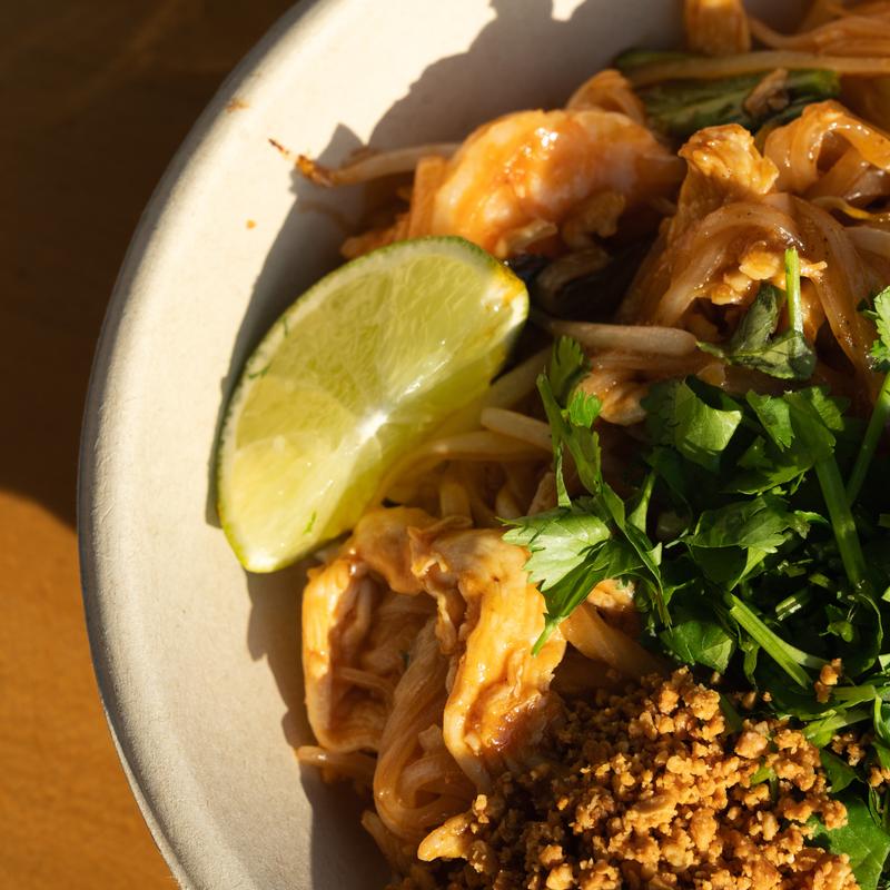 Rice noodles, eggs, sprouts, scallions, topped with cilantro, lime & peanuts